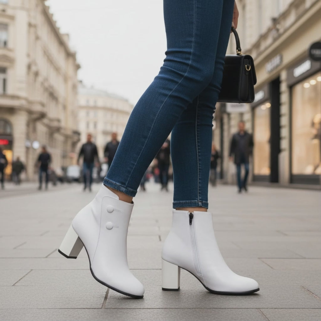 Botine dama din piele naturala alba cu toc gros 7.5 cm 14517