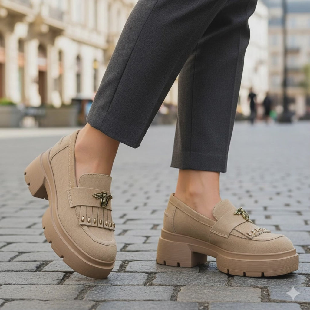 Designul elegant este completat de detaliul metalic decorativ și talpa groasă, care oferă stabilitate și susținere.