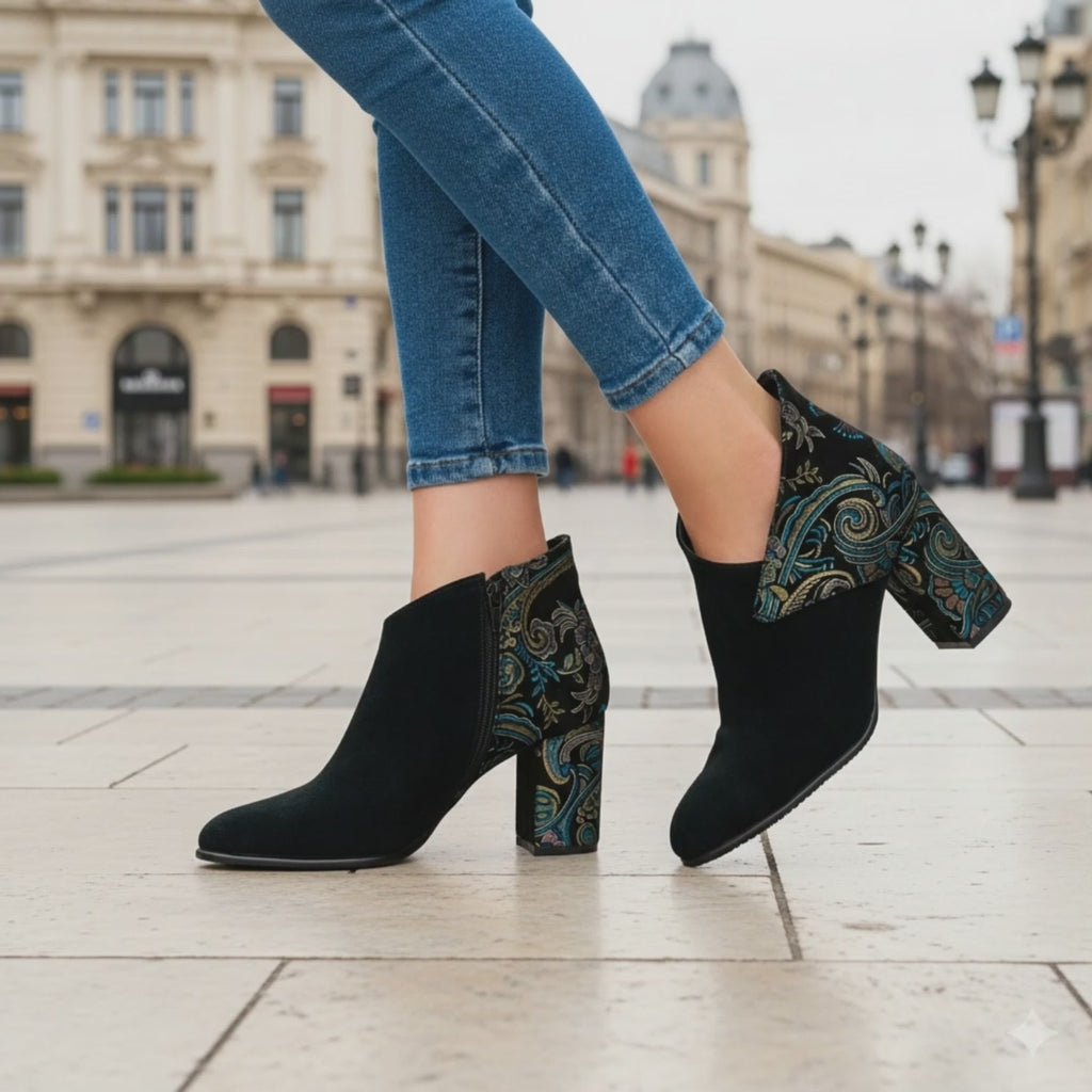 Botine negre dama cu model floral din piele naturala