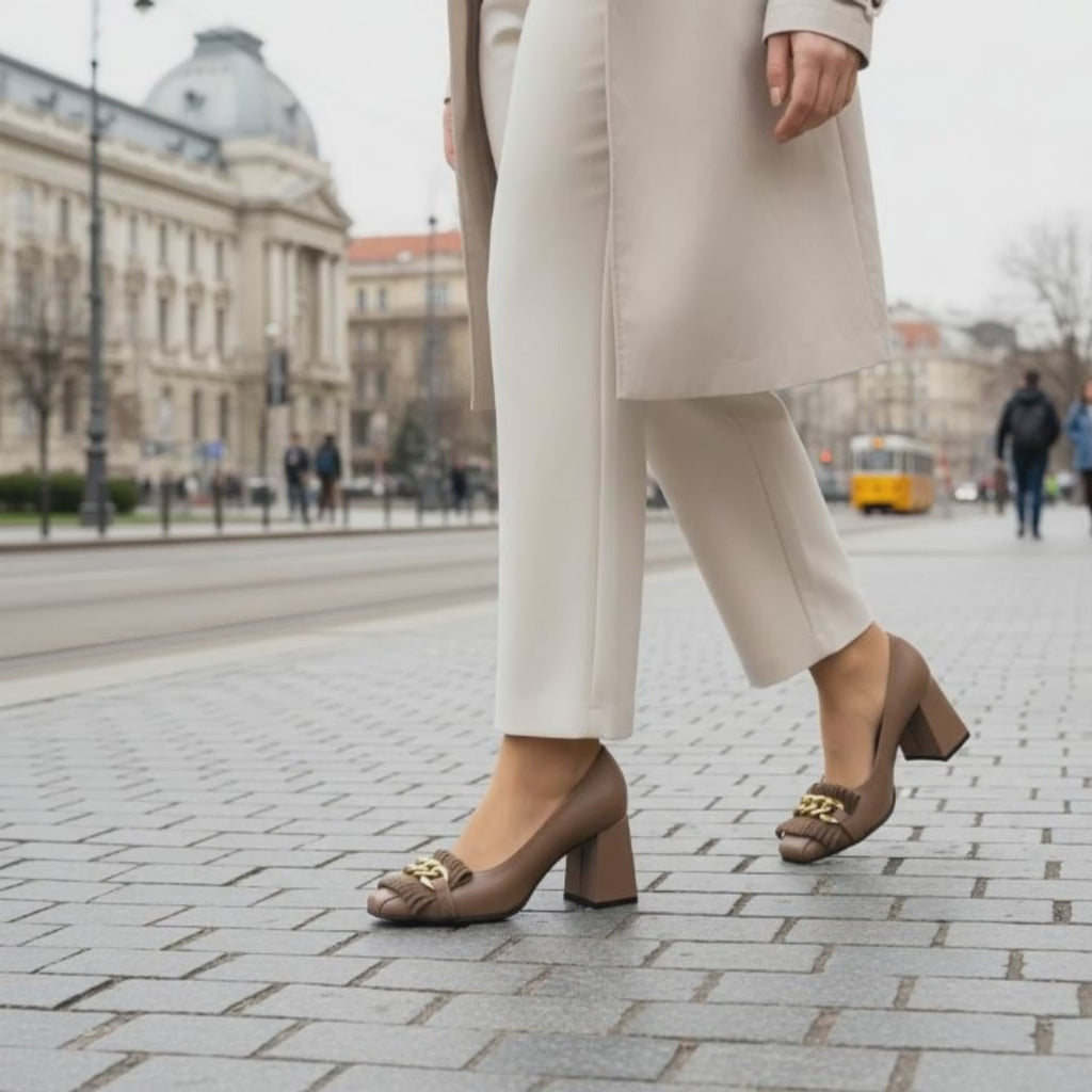 Pantofi dama din piele naturala bej cu toc gros 8 cm 17316