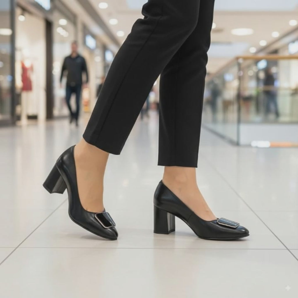 Pantofi dama din piele naturala neagra cu toc gros 7 cm 13769