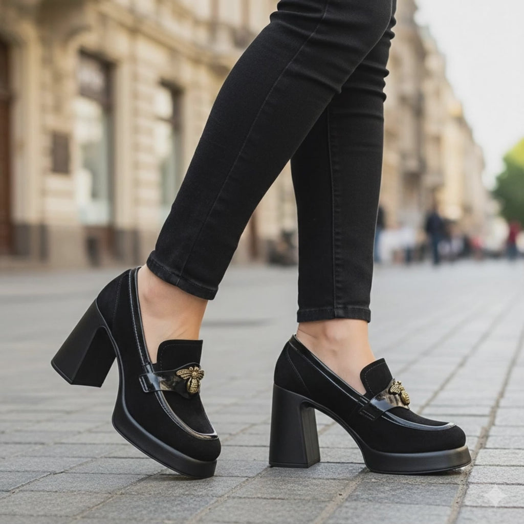 Pantofi dama din piele naturala neagra cu toc gros 9.5 cm 15526
